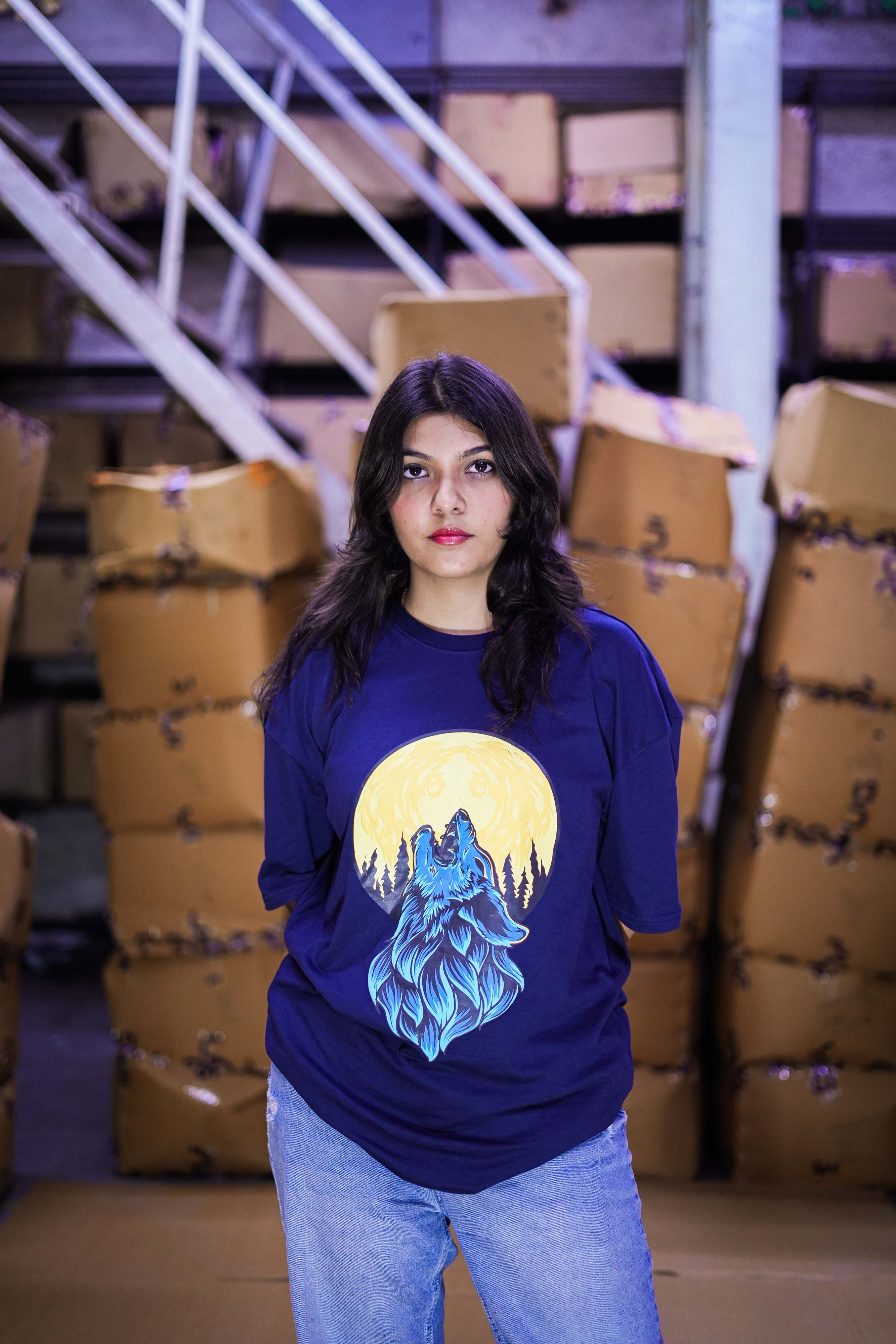 Women's Navy Blue 'Howling Wolf & Full Moon' Graphic Back Print T-Shirt