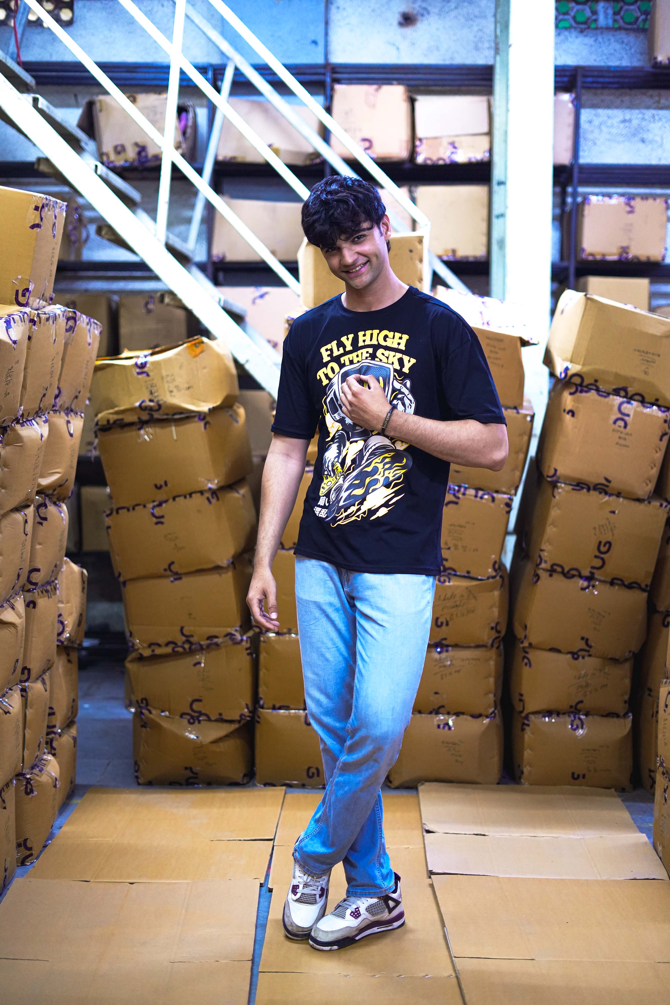 Men's Black 'Fly High to the Sky' Graphic Oversized T-Shirt
